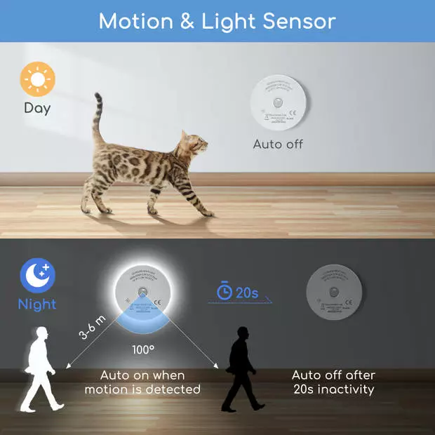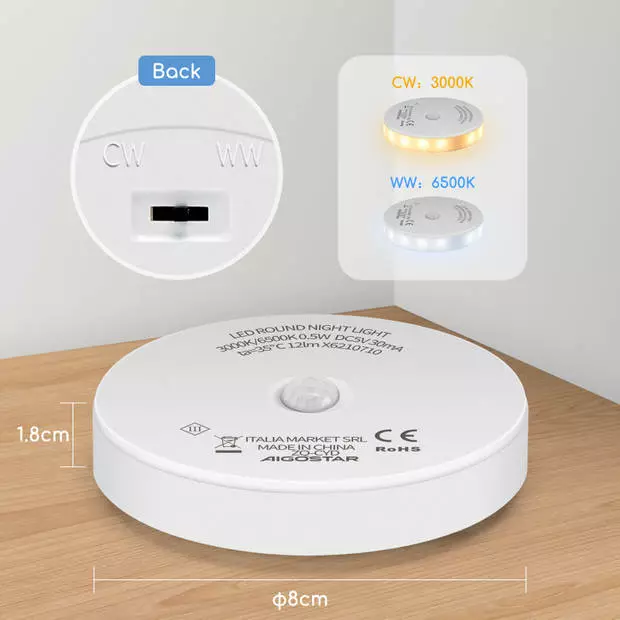 Dit nachtlampje heeft twee verstelbare kleurtemperaturen: warm wit 3000K en koel wit 6500K, die kunnen voldoen aan uw behoeften voor verschillende scenario’s en op veel plaatsen, zoals slaapkamer, kinderkamer, kast, gang, trap, garage.
