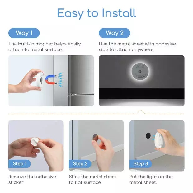 De lampbehuizing van het nachtlampje is voorzien van een magneet, die direct op het vlakke ijzeren oppervlak kan worden geabsorbeerd of met een bijpassend rond ijzeren(met 3m lijmpasta) plaatje kan worden bevestigd. Vergeleken met het plug-in nachtlampje