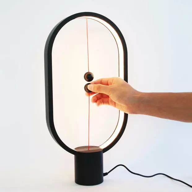 Wanneer je het onderste balletje optilt zal deze door het bovenste balletje aangetrokken worden waardoor het licht aan gaat. Zolang de balletjes in balans zijn zal de lamp blijven branden. Wil je de lamp uit doen? Doorbreek dan de balans door het onderste balletje weg te nemen bij het bovenste balletje en deze op de voet van de lamp te plaatsen. In de voet van de Heng Balance lamp zit een magneetje, zodat het balletje mooi blijft liggen.