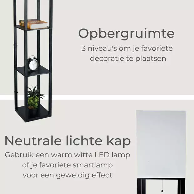 Uniek aan deze 2-in1 lamp is dat hij je naast sfeervolle verlichting ook opbergruimte biedt. Op de 3 plateau’s kun je decoratie, boeken en andere items kwijt.
